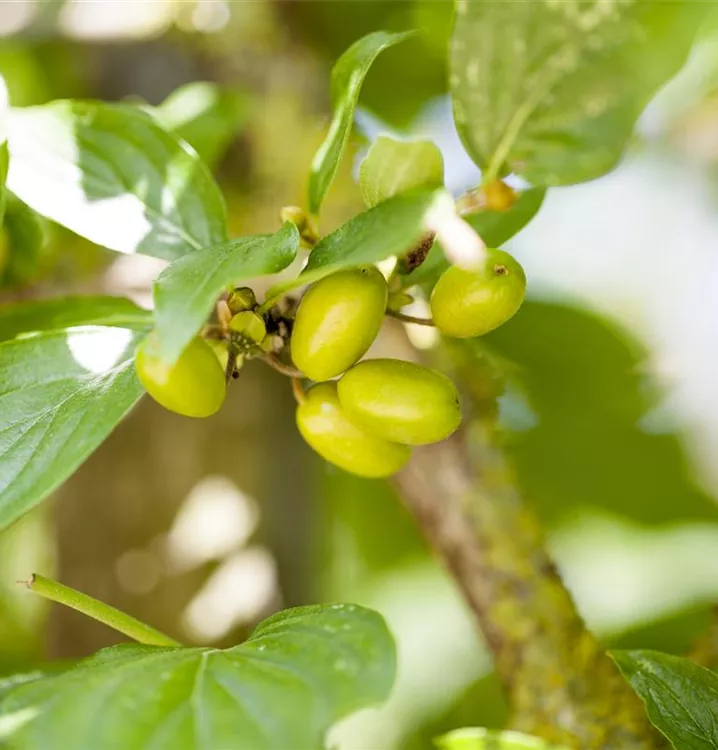 Die roten, ovalen Steinfrüchte der Kornelkirsche 'Jolico' sind ab August ausgereiften. Sie sind eine Zierde für sich! Der Geschmack der essbaren Steinfrüchte der Kornelkirsche 'Jolico' ist säuerlich.