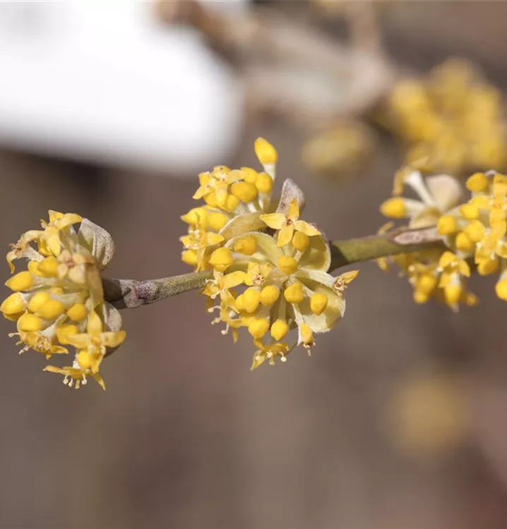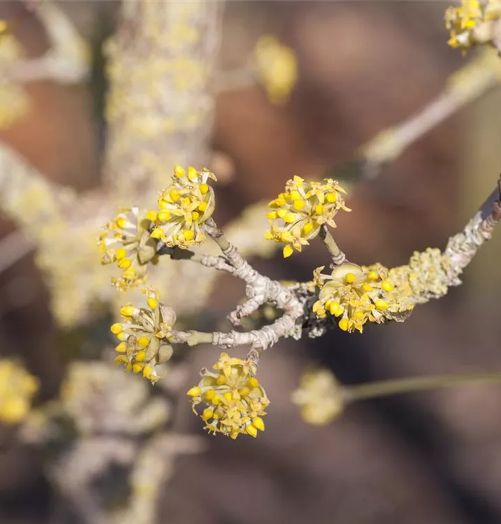 Cornus mas 'Jolico' bringt Dolden mit goldgelben Blüten, die von März bis April einen leichten Duft verbreiten, hervor.