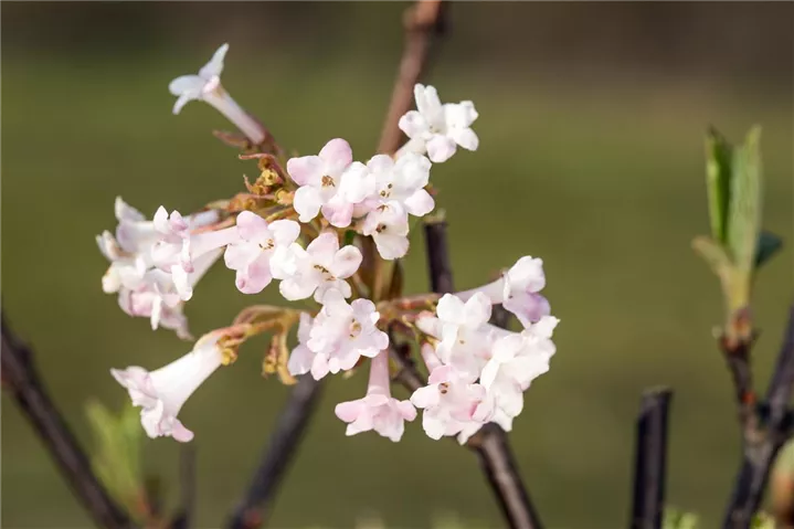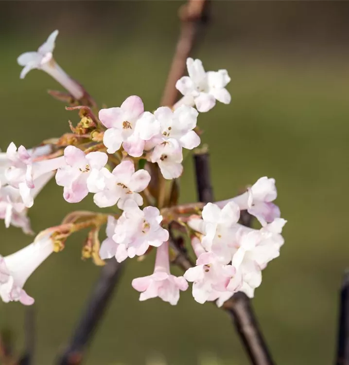 Viburnum x bodnantense 'Charles Lamont' bringt Rispen mit hellrosafarbenen Blüten, die von Januar bis April einen starken Duft verbreiten, hervor.