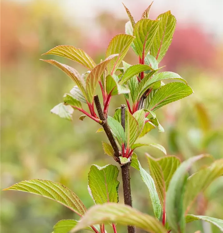 Die eiförmigen, gesägten Blätter dieses Laubgehölzes werden etwa 4 cm bis 10 cm groß. Mit ihren roten Blattstielen sind die Blätter gegenständig an den Zweigen angeordnet.