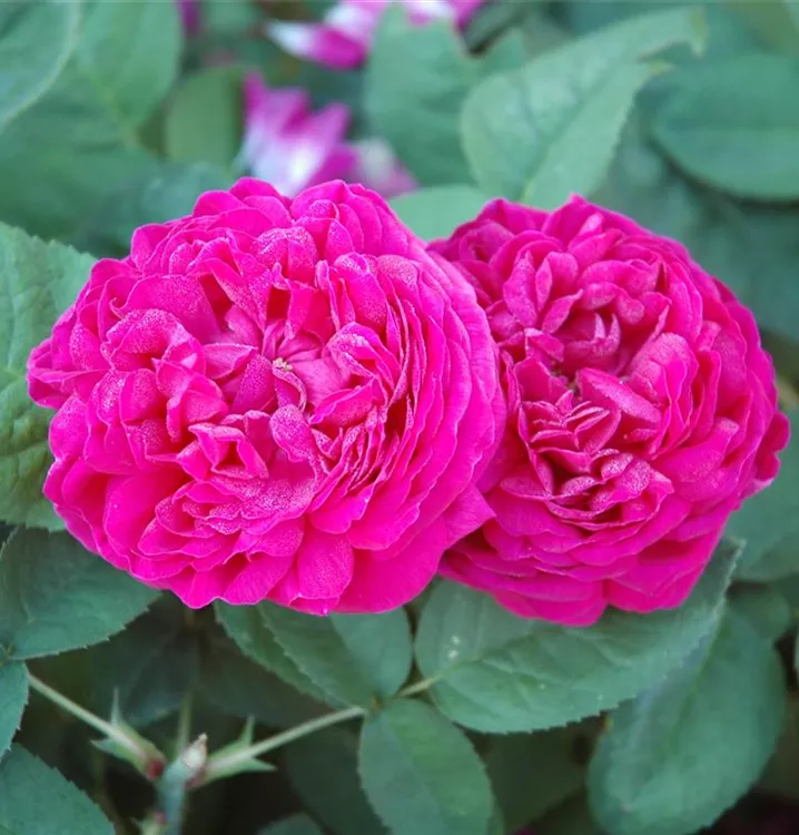 Als Grundlage für die Blütenpracht dient das dunkelgrüne Laub von Rosa 'Rose de Resht'.
