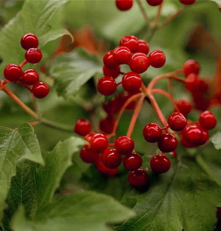 Eine Gartengestaltung ohne Gehölze ist möglich, aber der Gemeine Schneeball sollte schon seinen Platz bekommen. Nicht zuletzt wegen seiner roten Früchte, mit denen Viburnum opulus ab September einen dekorativen Blickfang bildet. Ihnen voraus gehen ab Mai weiße Blüten. Doch auch das sommergrüne Laubwerk spricht für dieses Gehölz. Die rundlichen, gelappten Blätter haben eine schöne hellgrüne Farbe.