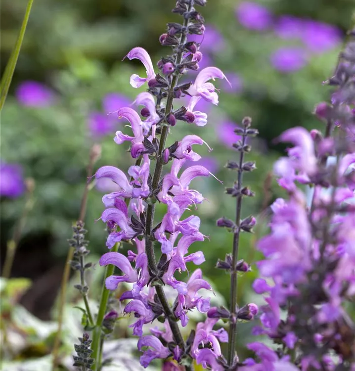 Salvia pratensis 'Rose Rhapsody' bringt Ähren mit rosafarbenen, lippenförmigen Blüten von Juni bis August hervor. Mit den richtigen Pflege ist ab September eine erneute Blüte möglich.
