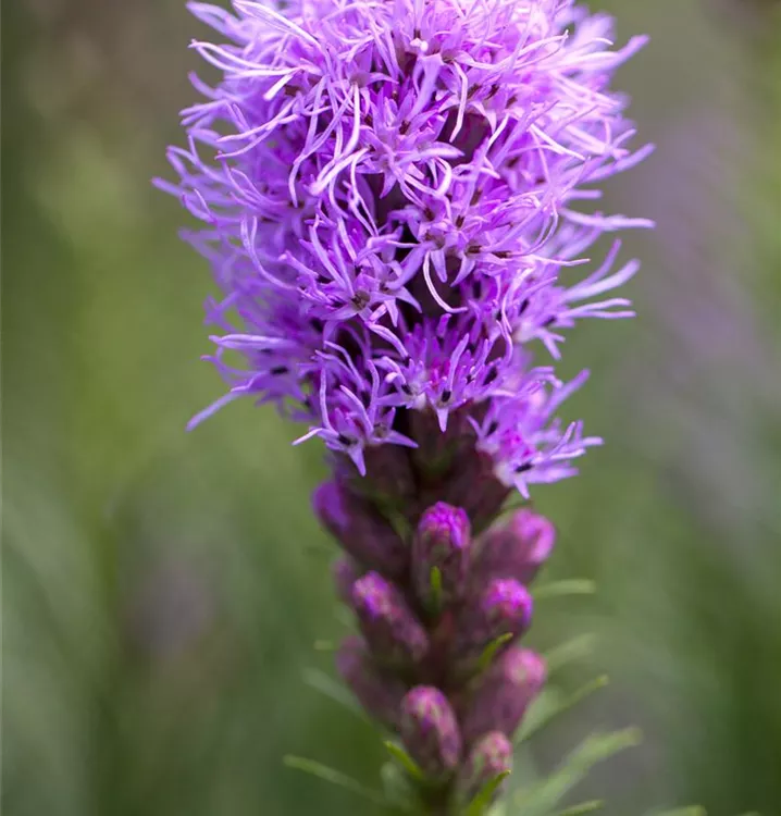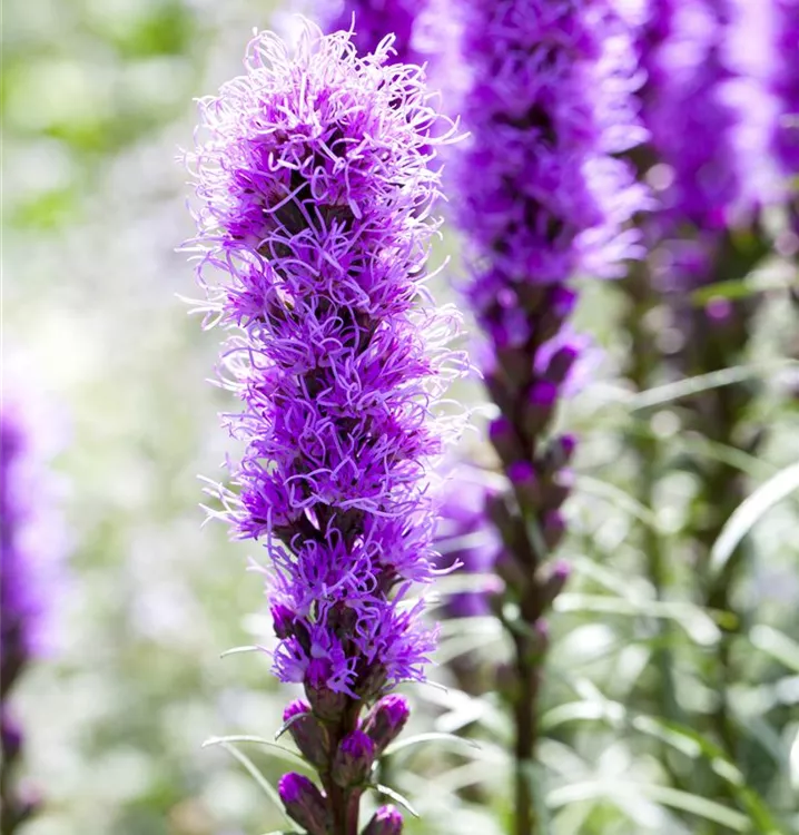 Liatris spicata 'Kobold' bringt Ähren mit violetten Blüten von Juli bis August hervor.