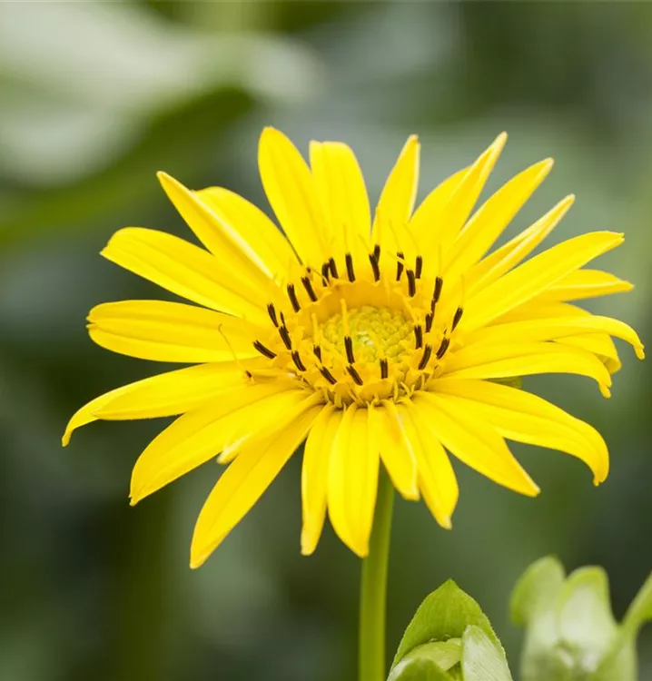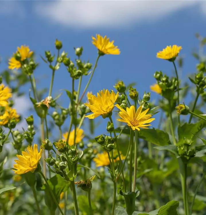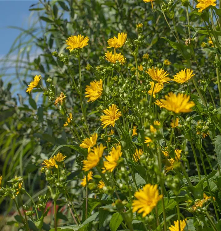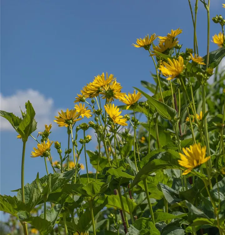 Silphium perfoliatum bringt gelbe, strahlenförmige Blüten von Juli bis September hervor.