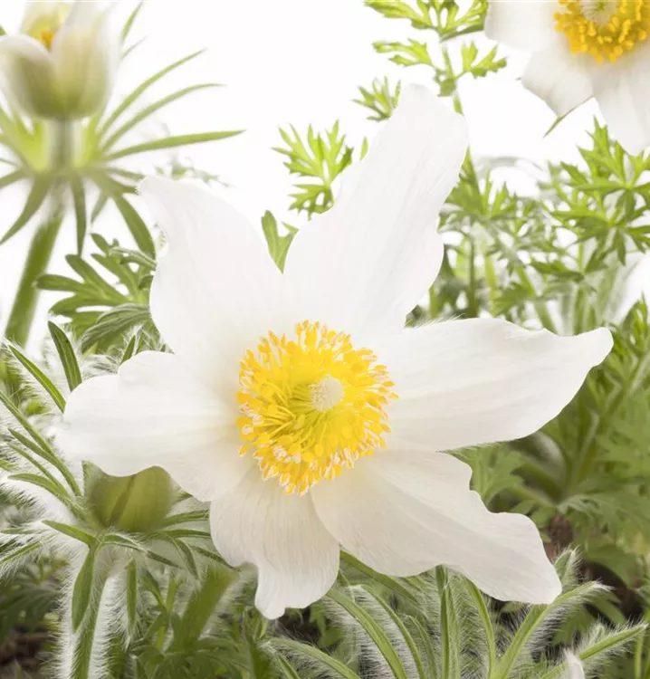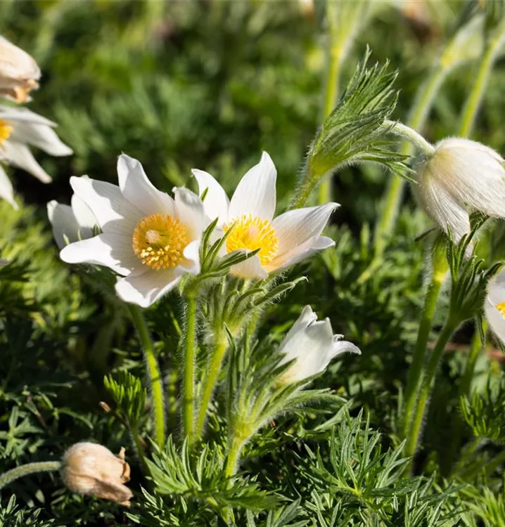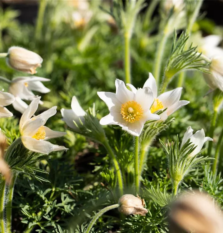 Die Weißblühende Garten-Kuhschelle 'Alba' kommt mit wenig Wasser zurecht.
