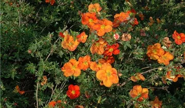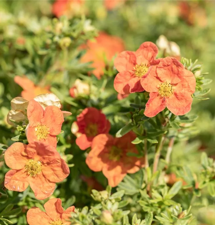 Potentilla fruticosa 'Red Ace' bringt orange-rote, schalenförmige Blüten von Juni bis Oktober hervor.