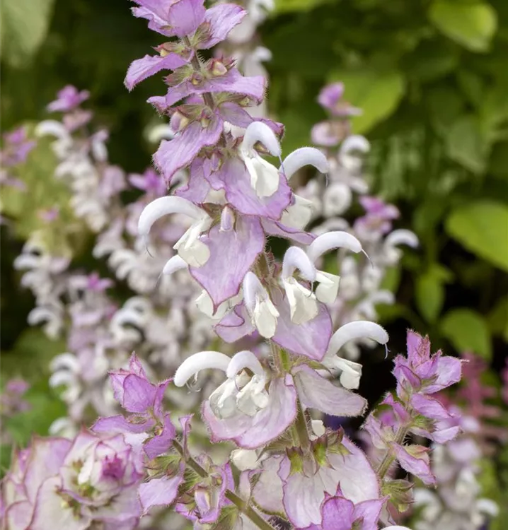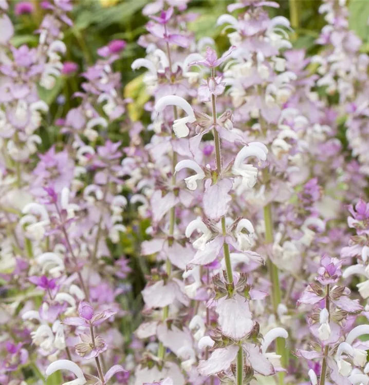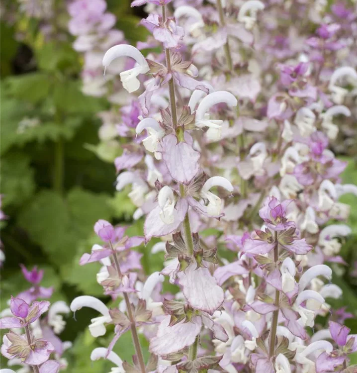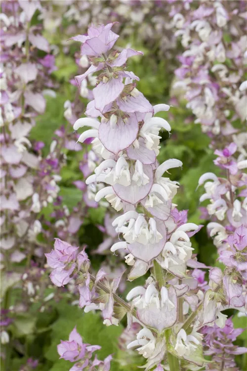 Salvia sclarea bringt Rispen mit rosafarbenen Blüten, die von Mai bis August einen starken Duft verbreiten, hervor.
