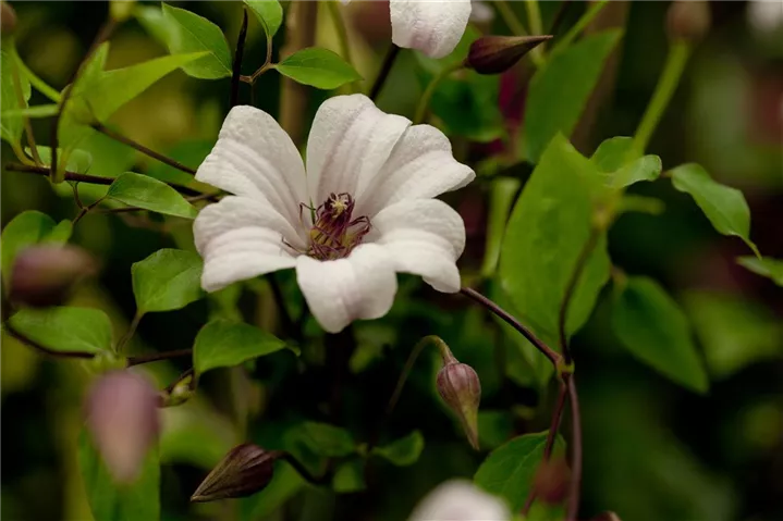 Ein Grund, warum die Texas-Waldrebe 'Princess Kate' eine Bereicherung in der Gartengestaltung ist, ist sicher ihre hübsche Blüte. Ab Juni stellt sie dies unter Beweis und lässt ihre weißen Blüten für sich sprechen. Aber natürlich gehören auch die gefiederten Blätter zu Clematis texensis 'Princess Kate' und tragen mit ihrer mittelgrünen Farbe zum Charakter dieser sommergrünen Kletterpflanze bei.