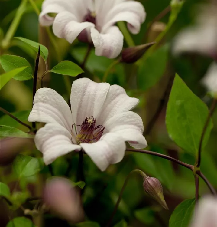 Clematis texensis 'Princess Kate' bringt weiße Blüten von Juni bis September hervor.