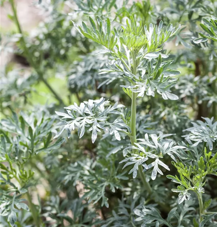 Der Echte Wermut ist wintergrün und trägt silbrige Blätter.