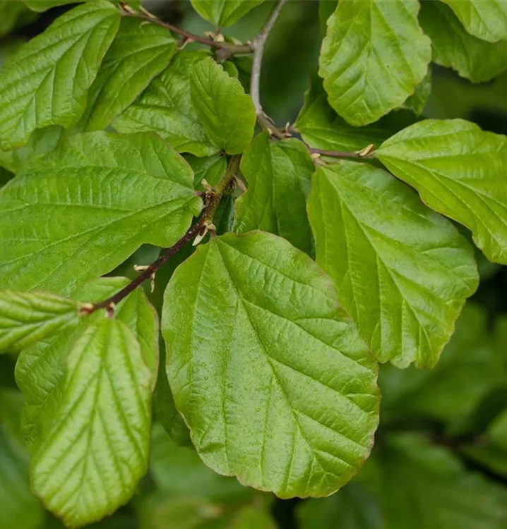 Seine rundlichen Blätter sind mittelgrün. Im Herbst verfärben sie sich prächtig orange. Grün-rot im Austrieb.
