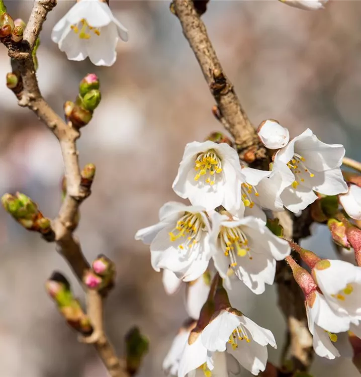 Prunus incisa 'Kojou-no-mai' bringt weiße, schalenförmige Blüten von März bis April hervor.