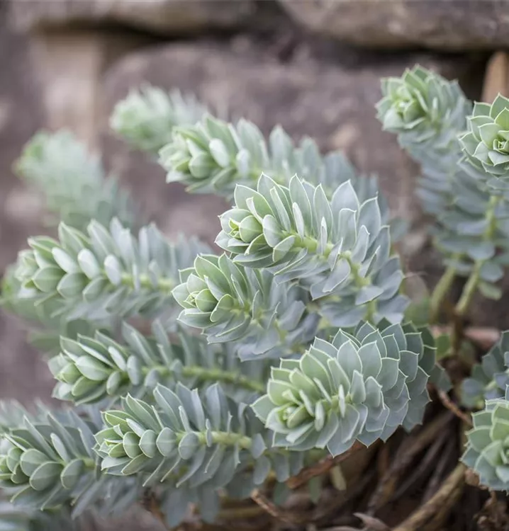 Die wintergrünen Blätter der Walzen-Wolfsmilch sind blau-grün, eiförmig, dickfleischig.
