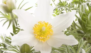 Pulsatilla vulgaris 'Alba' bildet glockenförmige, weiße Blüten ab März.