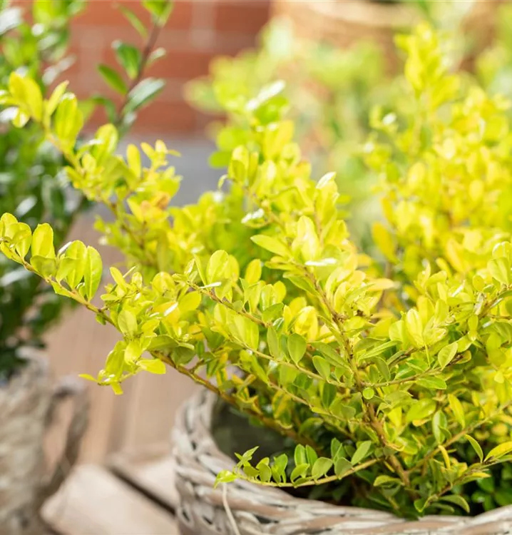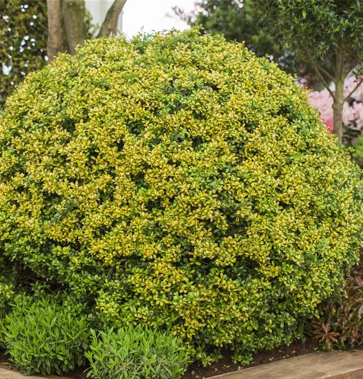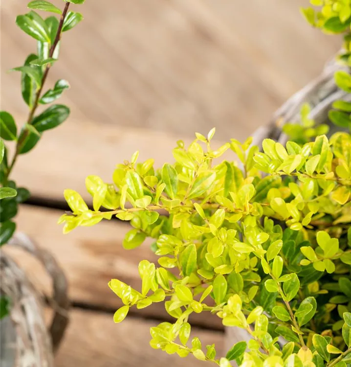Eine Gartengestaltung ohne Gehölze ist möglich, aber der Gelbe Berg-Ilex 'Golden Gem' sollte schon seinen Platz bekommen. Nicht zuletzt wegen seiner Früchte, mit denen Ilex crenata 'Golden Gem' einen dekorativen Blickfang bildet. Ihnen voraus gehen ab Mai weiße Blüten. Doch auch das immergrüne Laubwerk spricht für dieses Gehölz. Die rundlichen Blätter haben eine schöne goldgelbe Farbe.