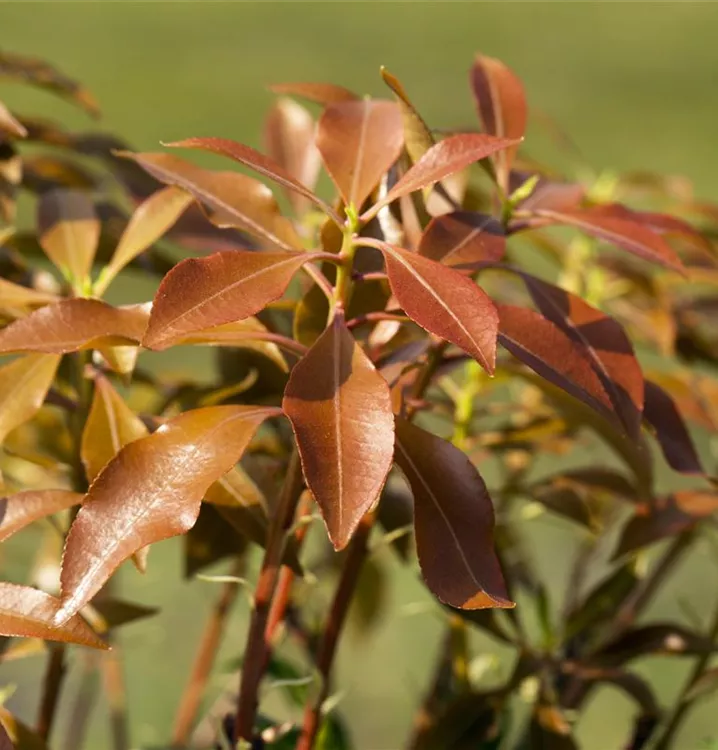 Seine lanzettlichen Blätter sind dunkelgrün. Dunkelrot im Austrieb.
