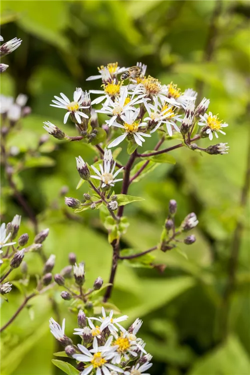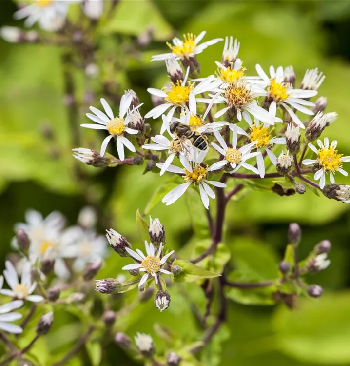 Ein Grund, warum die Sperrige Aster eine Bereicherung für den Garten ist, sind sicher ihre hübschen Blüten. Ab August stellt sie dies unter Beweis und lässt ihre angenehm duftenden, weißen Blüten für sich sprechen. Bienen und andere Insekten sind schon längst überzeugt von ihren Blüten-Qualitäten. Aber natürlich gehören auch die eiförmigen Blätter zu Aster divaricatus und tragen mit ihrer mittelgrünen Farbe zum Charakter dieser wintergrünen Staude bei. Als I-Tüpfelchen schmückt sich diese Staude ab Oktober mit silbrigen Früchten.