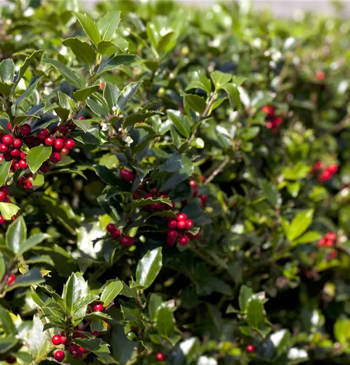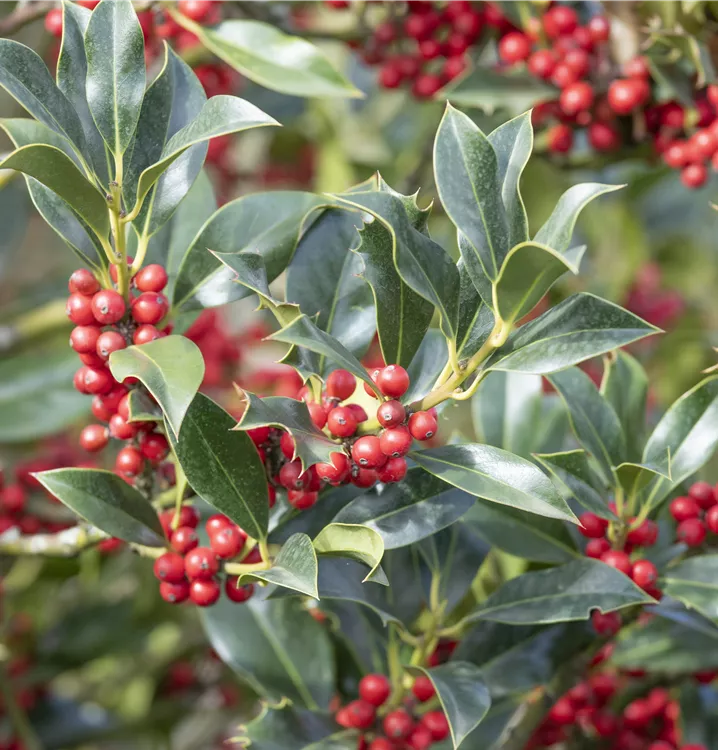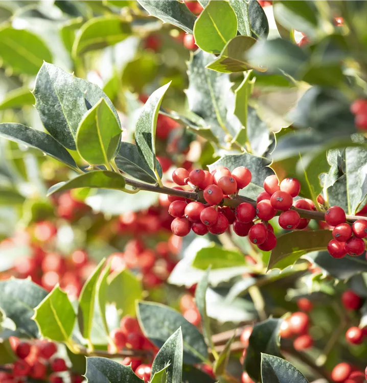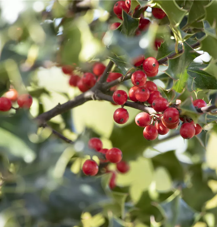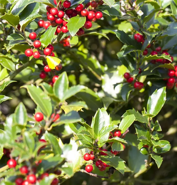 Eine Gartengestaltung ohne Gehölze ist möglich, aber die Alaska-Stechpalme 'Alaska' sollte schon ihren Platz bekommen. Nicht zuletzt wegen ihrer runden, roten Früchte, mit denen Ilex aquifolium 'Alaska' ab Oktober einen dekorativen Blickfang bildet. Ihnen voraus gehen ab Mai cremeweiße Blüten. Doch auch das immergrüne Laubwerk spricht für dieses Gehölz. Die lanzettlichen, gezähnten Blätter haben eine schöne dunkelgrüne Farbe.