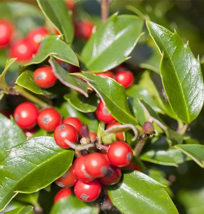 Die roten, kleinen, runden Steinfrüchte der Alaska-Stechpalme 'Alaska' sind ab Oktober ausgereiften. Sie sind eine Zierde für sich!