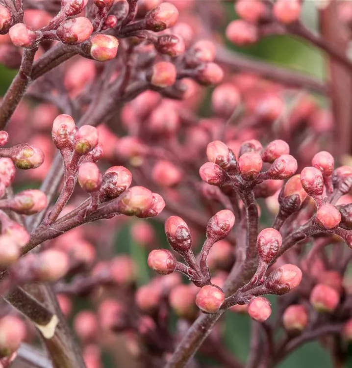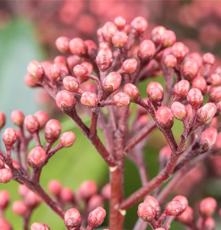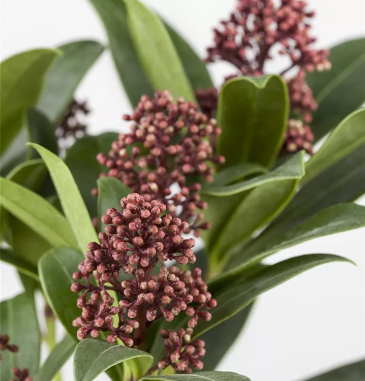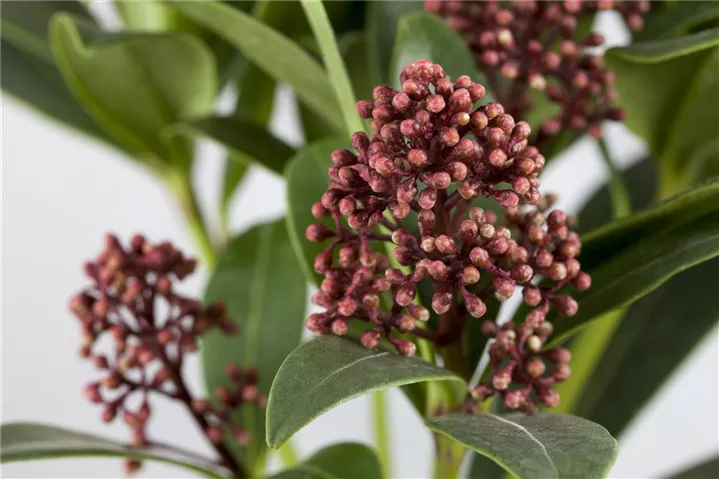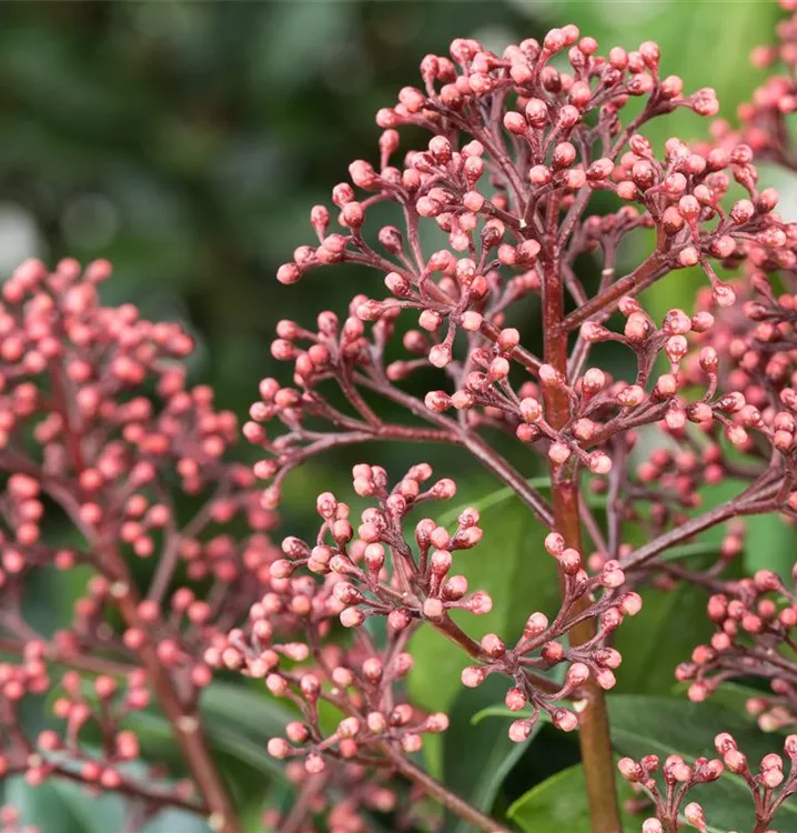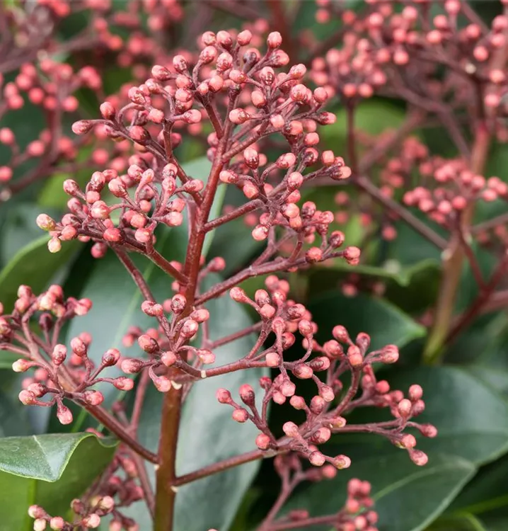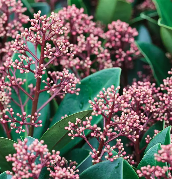 Skimmia japonica 'Rubella' bringt Rispen mit roten Blüten, die von April bis Mai einen starken Duft verbreiten, hervor.