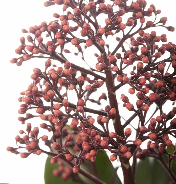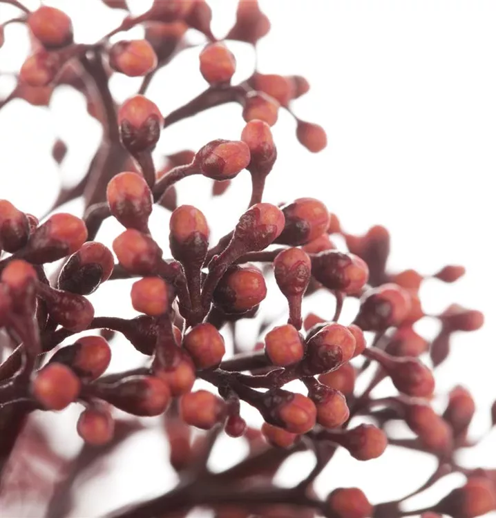 Dieses Laubgehölz ist ein Kleinstrauch, der ausgewachsen Größen von 60 cm bis 1 m Höhe erreicht und etwa 60 cm bis 1,5 m breit wird. Dafür lässt Skimmia japonica 'Rubella' sich aber Zeit: im Jahr kommen etwa 10 cm bis 20 cm an Höhe dazu. Der Wuchs von Skimmia japonica 'Rubella' gestaltet sich buschig und kompakt.