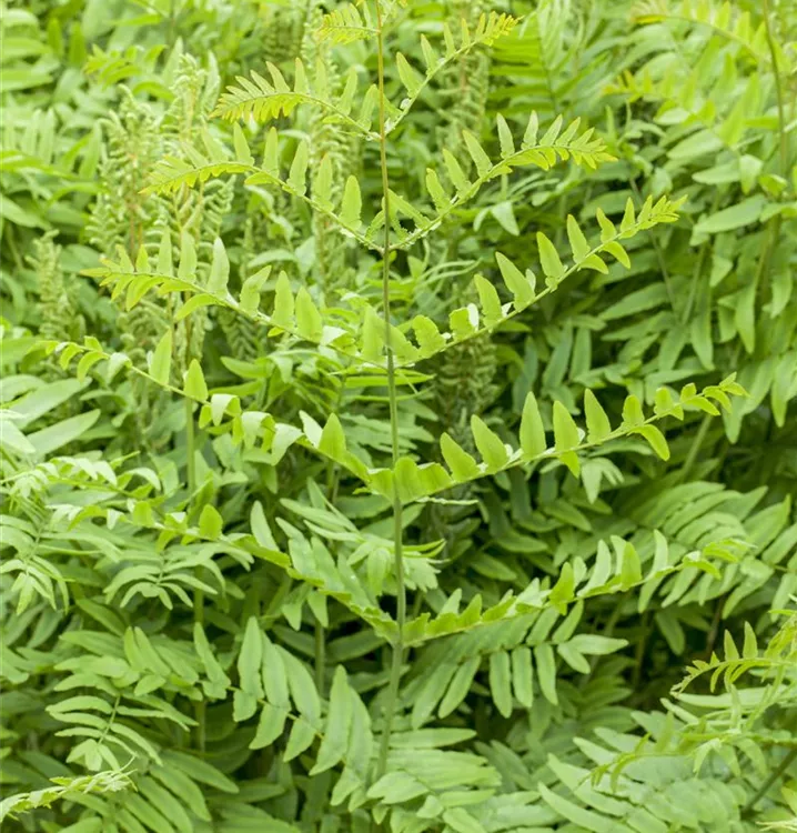 Nicht zu übersehen im Garten ist der Königsfarn als sommergrüne Pflanze. Die, im Austrieb noch braun gefärbten Blätter fallen sofort ins Auge mit ihrer mittelgrünen Farbe. Im Herbst geht die Blattfarbe dann in ein Goldgelb über. Doch auch die gefiederte Form der Blätter trägt zur Schönheit dieses Farnes bei.
