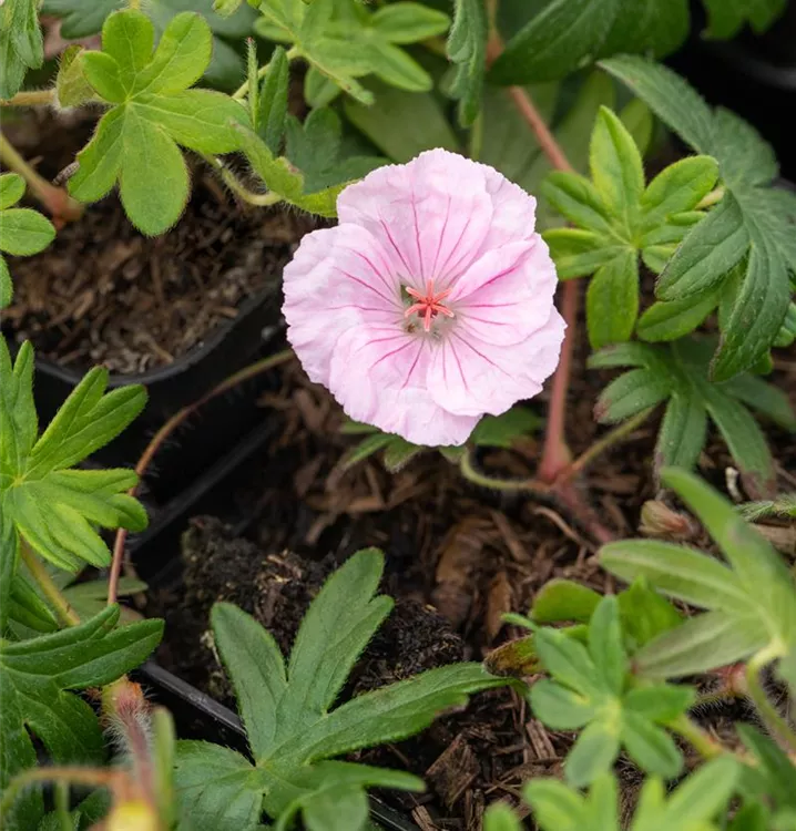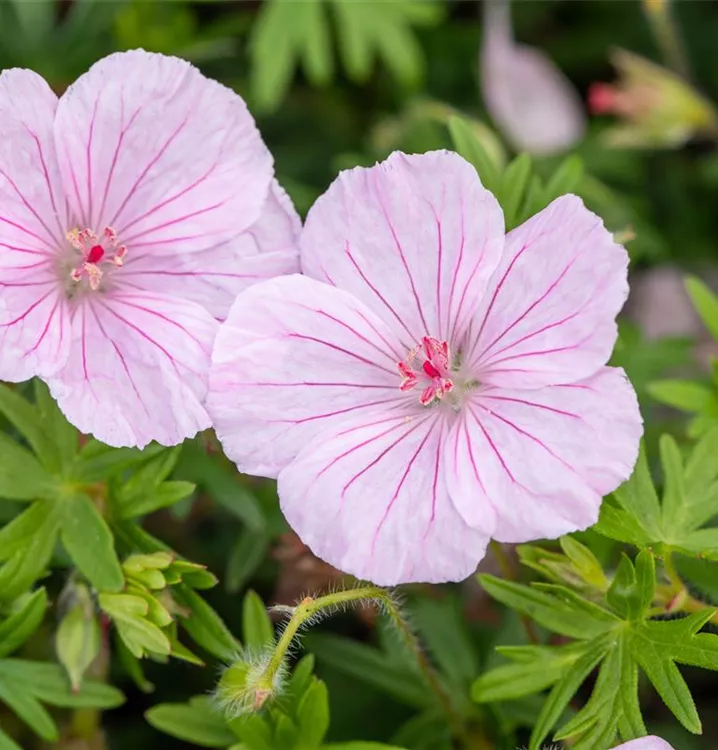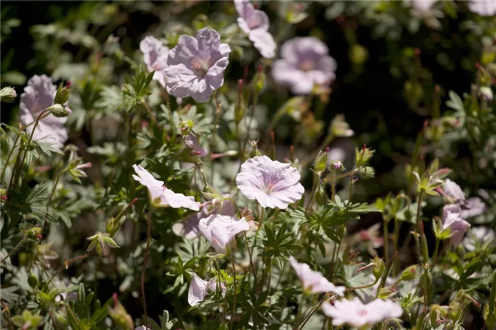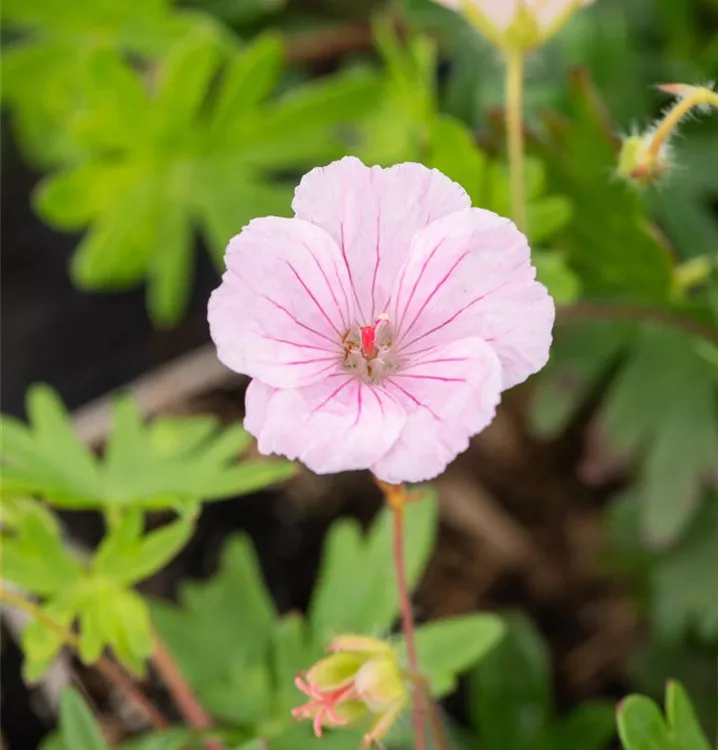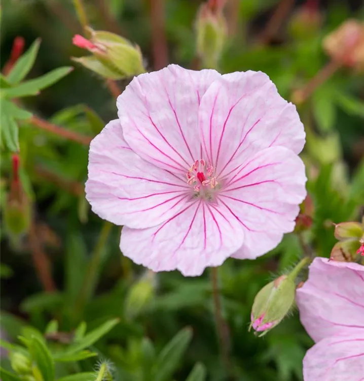 Ein Grund, warum der Gestreifte Storchschnabel eine Bereicherung für den Garten ist, sind sicher seine hübschen Blüten. Ab Juni stellt er dies unter Beweis und lässt seine hellrosafarbenen Blüten für sich sprechen. Bienen und andere Insekten sind schon längst überzeugt von seinen Blüten-Qualitäten. Eine gute Pflege belohnt Geranium sanguineum var. striatum übrigens mit einer zweiten Blüte ab September. Aber natürlich gehören auch die rundlichen, gelappten Blätter zu Geranium sanguineum var. striatum und tragen mit ihrer mittelgrünen Farbe zum Charakter dieser sommergrünen Staude bei.