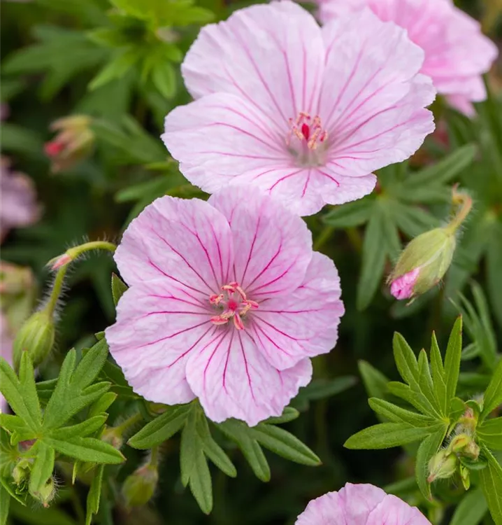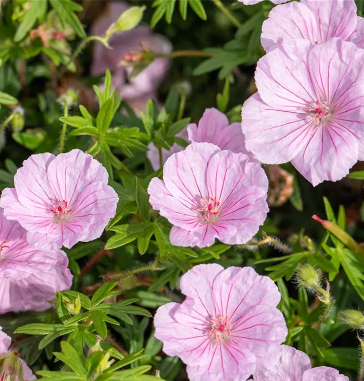 Geranium sanguineum var. striatum bringt hellrosafarbene, schalenförmige Blüten von Juni bis August hervor. Mit den richtigen Pflege ist ab September eine erneute Blüte möglich.