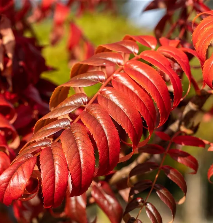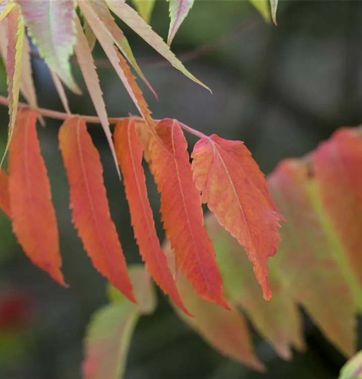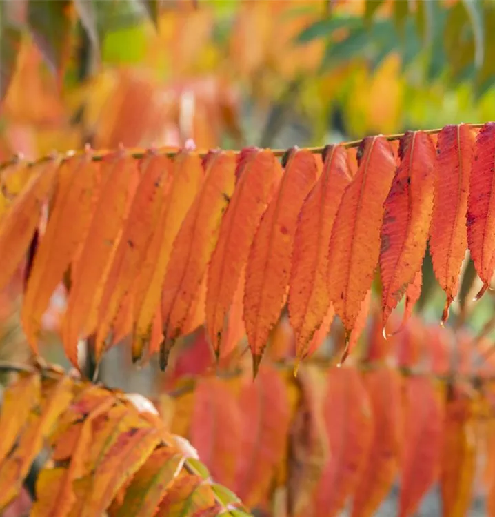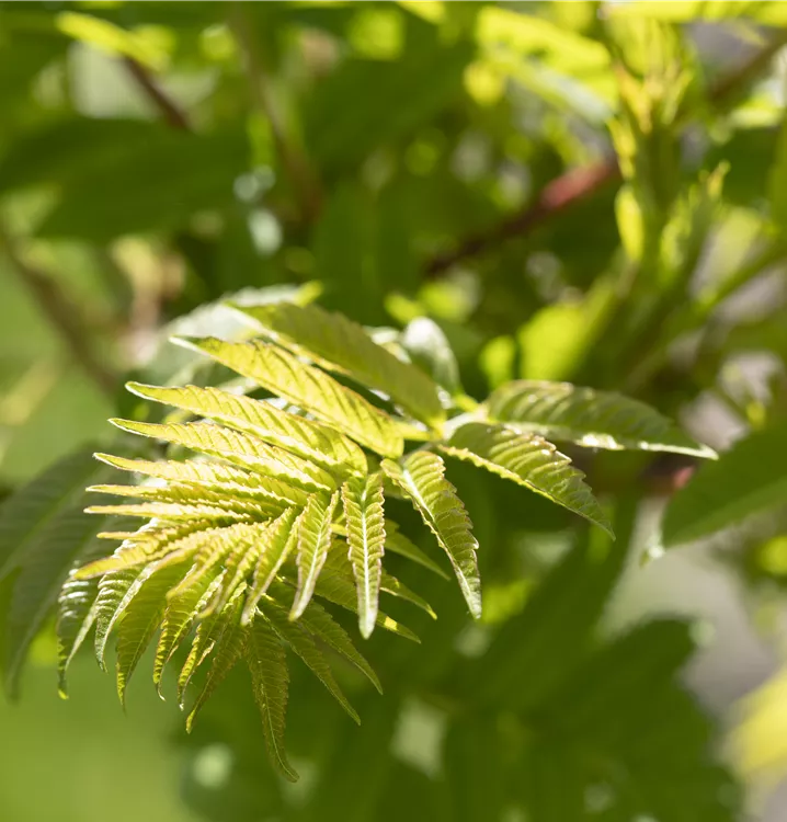 Der Essigbaum ist sommergrün und trägt mittelgrüne Blätter.