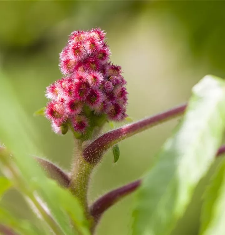 Rhus typhina bringt Rispen mit hellgrünen Blüten von Juni bis Juli hervor.