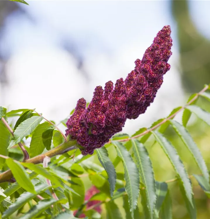 Eine Gartengestaltung ohne Gehölze ist möglich, aber der Essigbaum sollte schon seinen Platz bekommen. Nicht zuletzt wegen seiner Früchte, mit denen Rhus typhina ab Anfang August einen dekorativen Blickfang bildet. Ihnen voraus gehen ab Juni hellgrüne Blüten. Doch auch das sommergrüne Laubwerk spricht für dieses Gehölz. Die gefiederten Blätter haben eine schöne mittelgrüne Farbe.