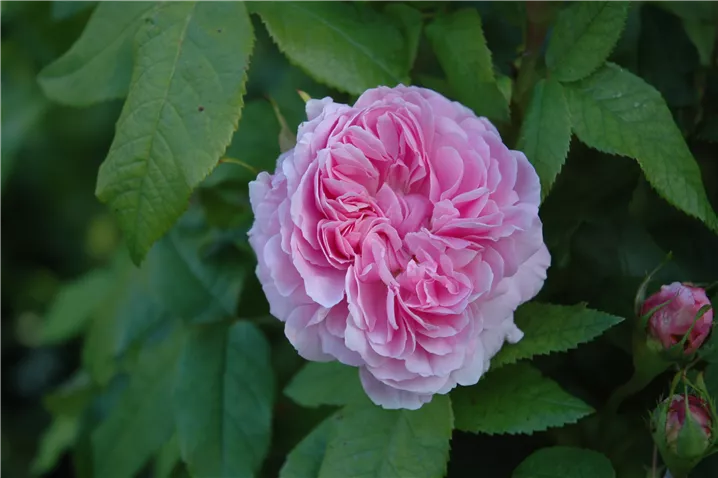 Die Parkrose 'Jacques Cartier' ist sommergrün und trägt dunkelgrüne Blätter.