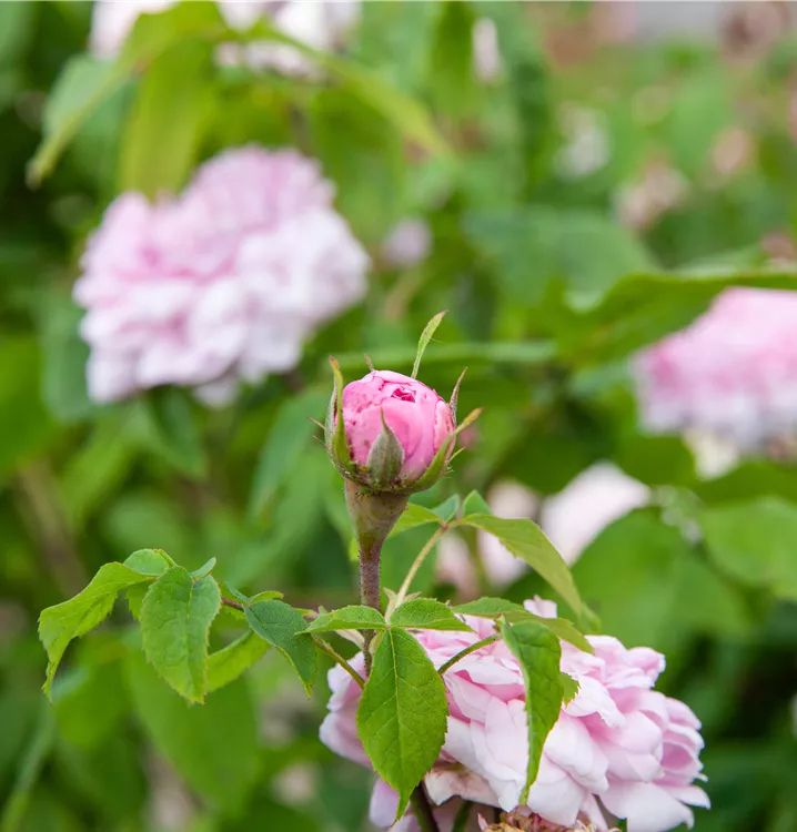 Die Zweige von Rosa x damascena 'Jacques Cartier' sind bestachelt.