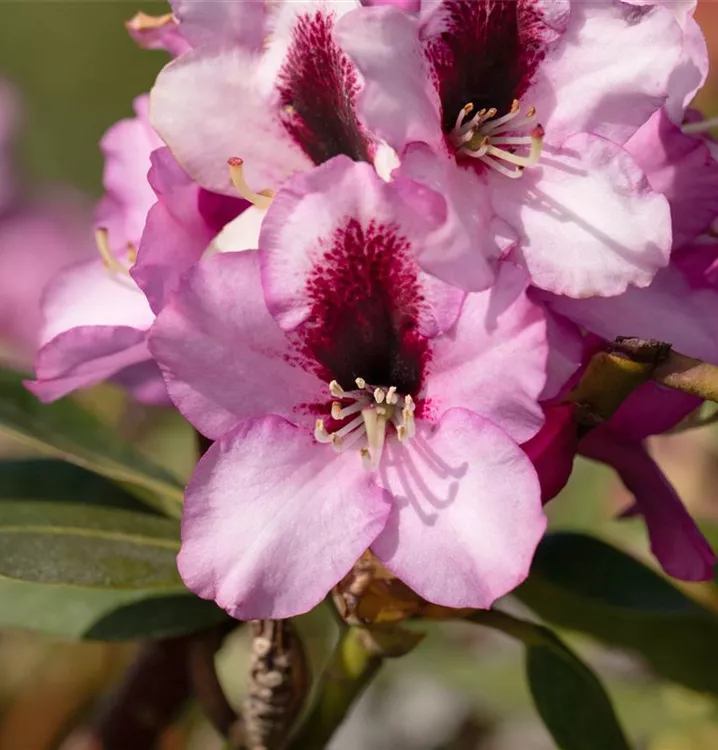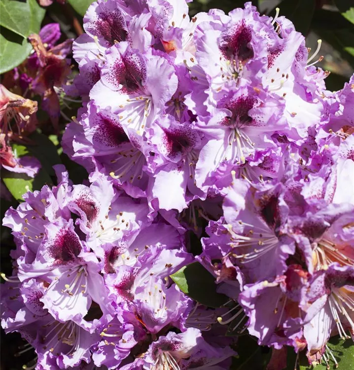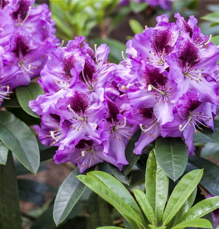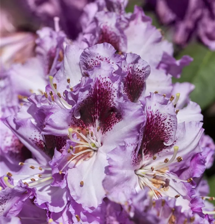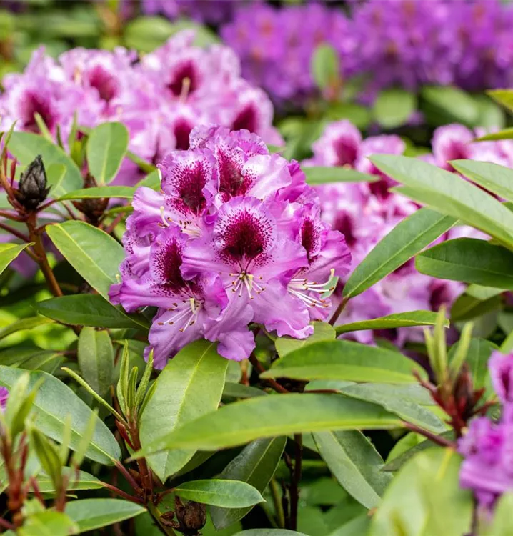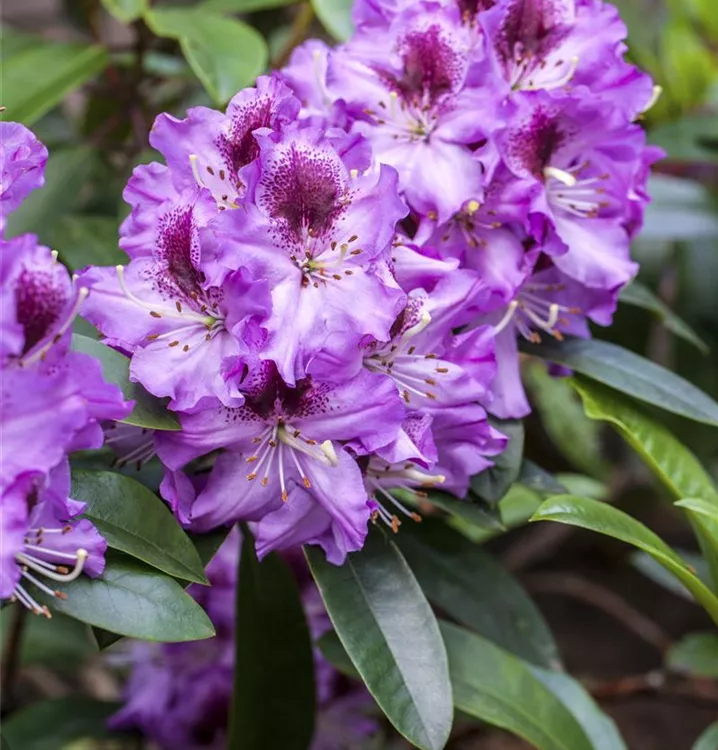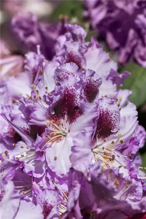 Rhododendron 'Pfauenauge'® bringt Dolden mit lilafarbenen, trichterförmigen Blüten von Ende Mai bis Mitte Juni hervor. Ihre dunkelrote Zeichnung gibt ihnen einen zusätzlichen Zierwert.
