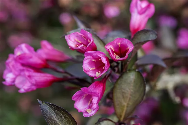 Weigela florida 'Alexandra'(s) bringt dunkelrosafarbene, trichterförmige Blüten von Mai bis Juni hervor. Dabei werden die einzelnen Blüten etwa 2 cm bis 3 cm groß.