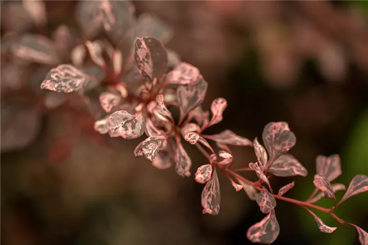Die Berberitze 'Harlequin' ist sommergrün und trägt rosafarbene bis panaschierte Blätter.