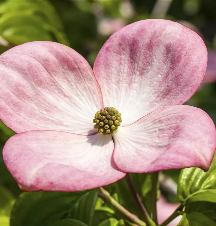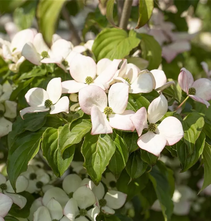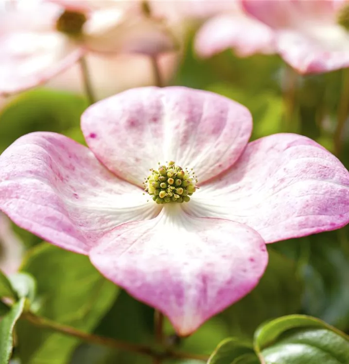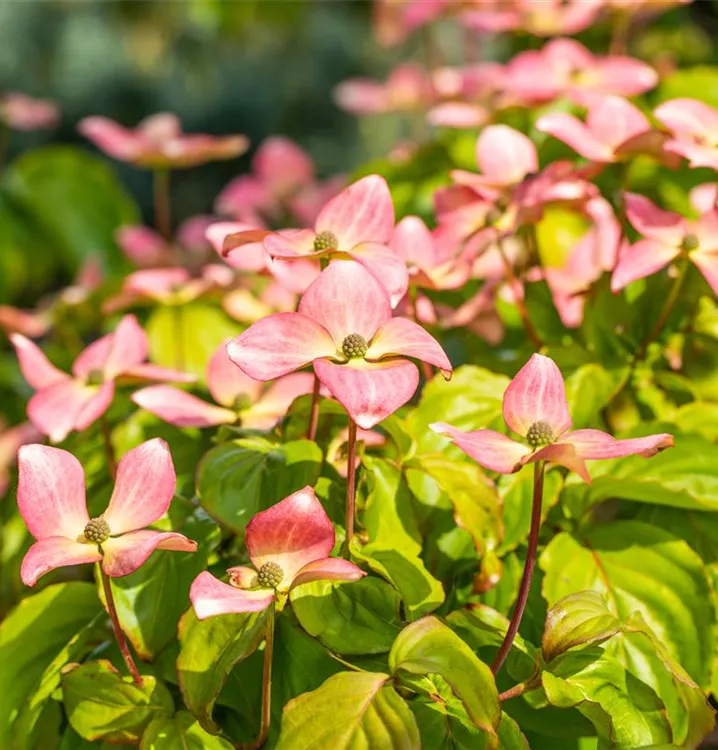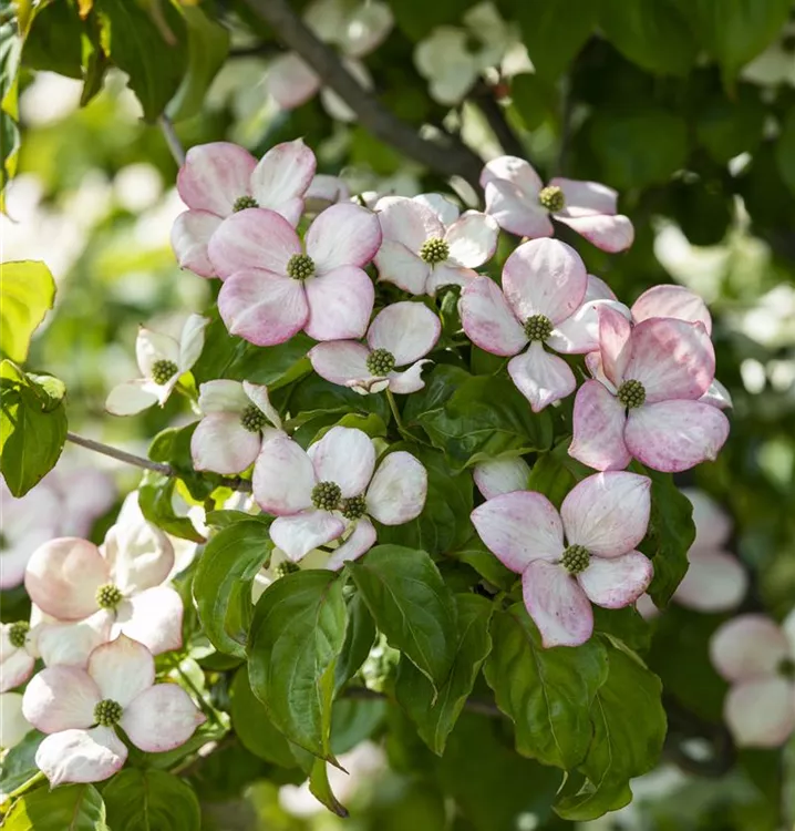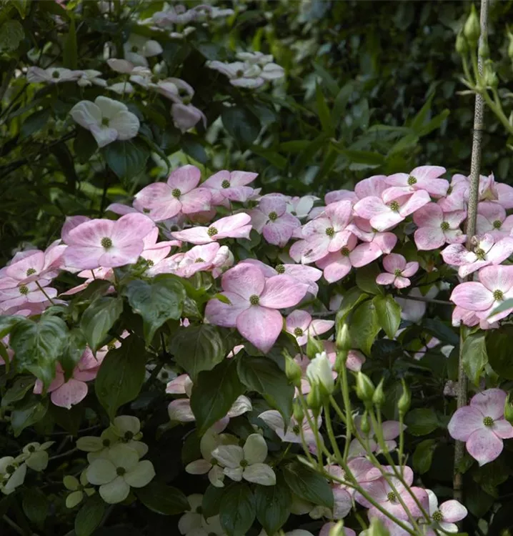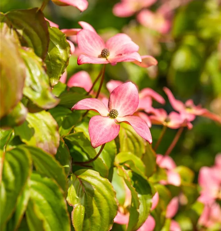 Cornus kousa 'Satomi'® bringt rosarote Blüten von Ende Mai bis Juni hervor. Dabei werden die einzelnen Blüten etwa 8 cm bis 9 cm groß.