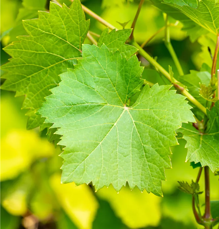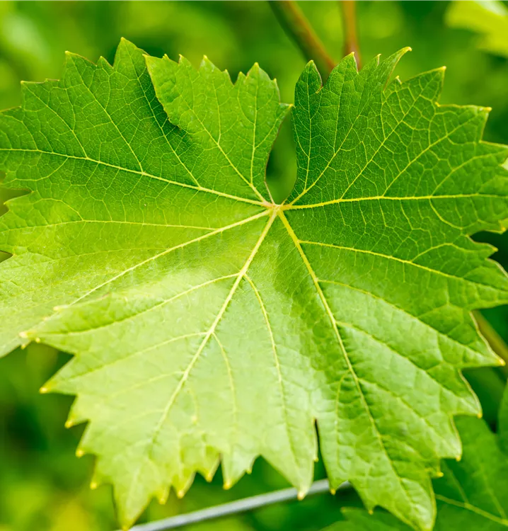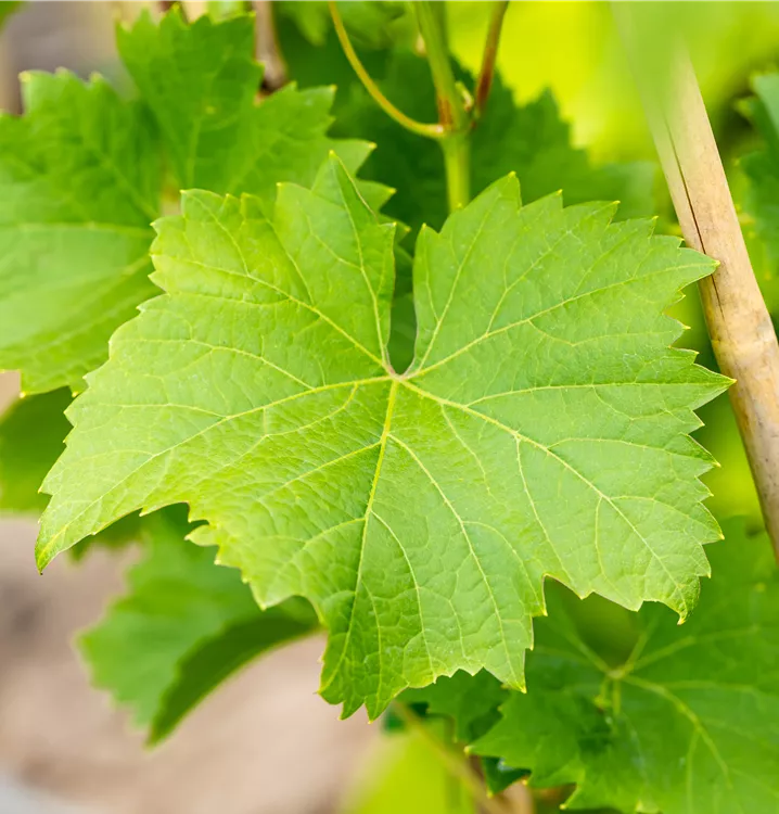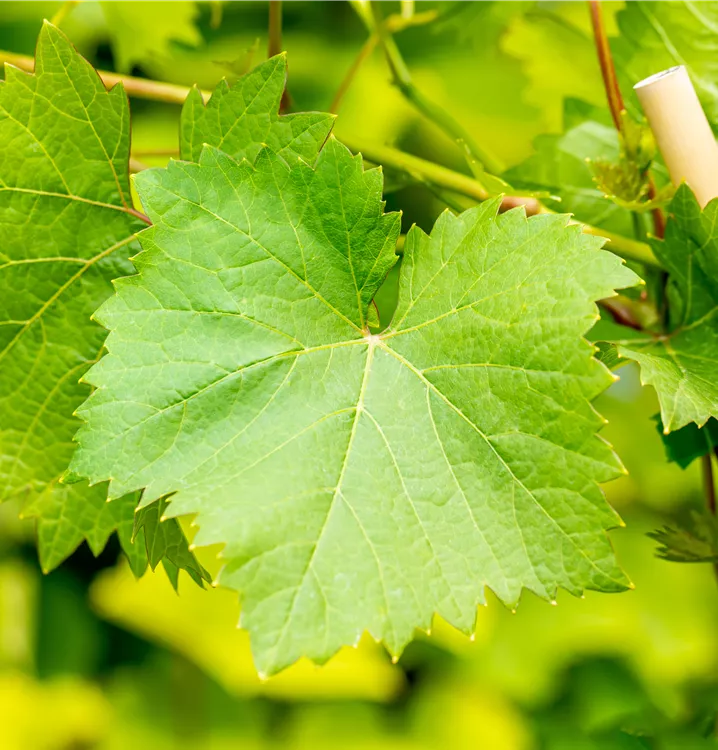 Die Tafeltraube 'Nero'(s) ist sommergrün und trägt dunkelgrüne Blätter.