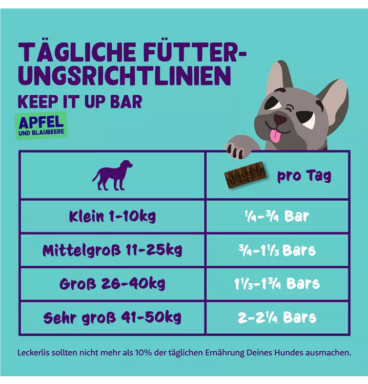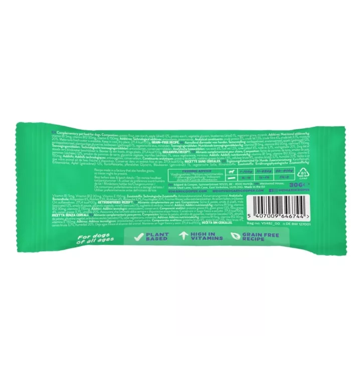 Kartoffelstärke, Kartoffelmehl, pflanzliches Glycerin, Apfel (getrocknet) 10%, Erbsenfaser, Blaubeeren (getrocknet) 1%, Hefen (getrocknet)