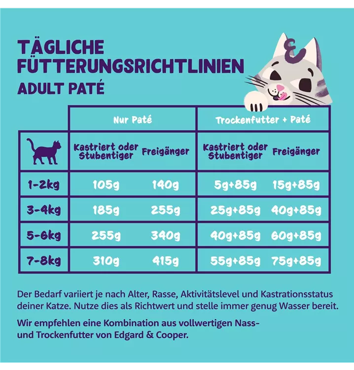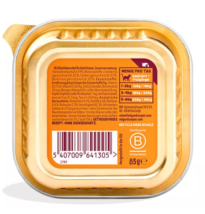 Ein vollwertiges Festmahl, ideal für alle ausgewachsenen, sowie kastrierten Katzen. Unser samtiges Paté mit viel Freilauf-Huhn wird deine Fellnase zur Grinsekatze machen.