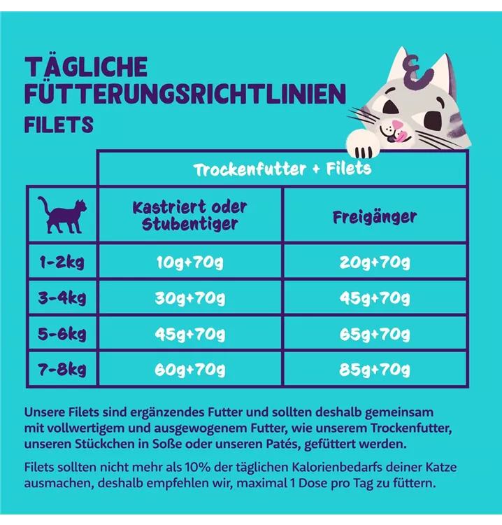 Diese leckeren Filets sind eine tolle Ergänzung zum Futter deiner Katze. Sie sind ideal für alle Katzen ab einem Alter von acht Wochen sowie kastrierte Katzen geeignet.