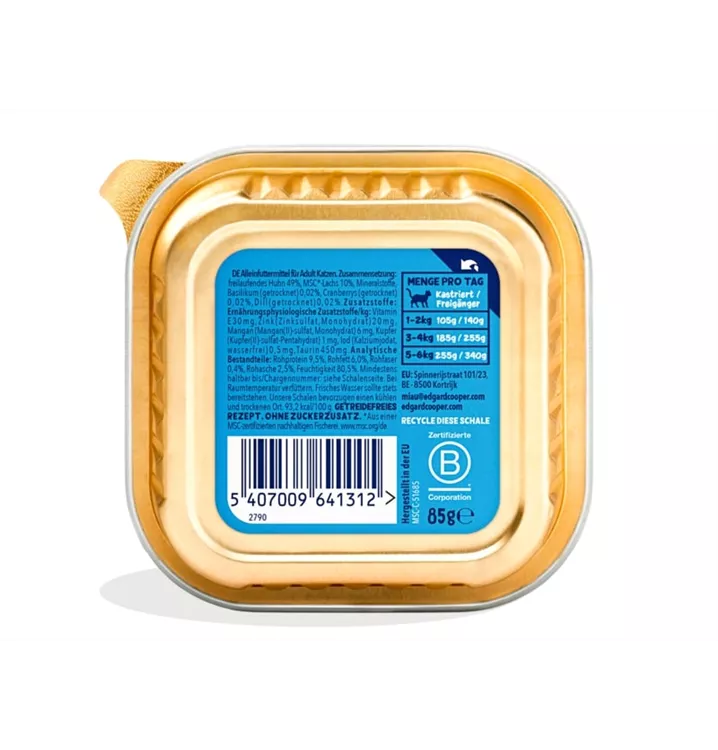 Und mit einer leckeren Kombination aus Lachs aus MSC-zertifizierter, nachhaltiger Fischerei und Freilauf-Huhn bekommt deine Katze das Beste vom Land und aus dem Meer. Das Paté ist frei von künstlichem Farbstoffe, Aromen oder Zuckerzusätze. Außerdem sind all unsere Rezepte getreidefrei und leicht verdaulich.