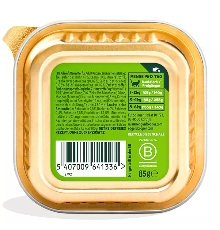Ein vollwertiges Festmahl, ideal für alle ausgewachsenen, sowie kastrierten Katzen. Unser samtiges Paté mit viel leckerem Lamm und Freilauf-Huhn wird deine Fellnase zur Grinsekatze machen.