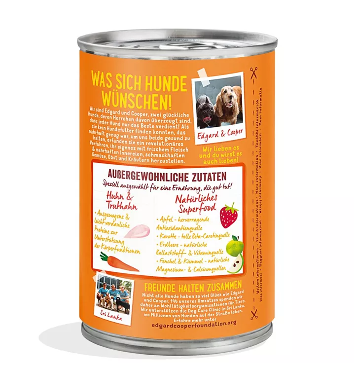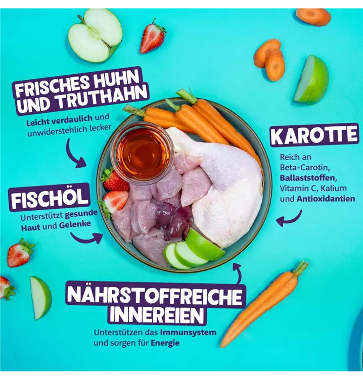 Huhn 52%, Truthahn 8%, Karotte 2%, Mineralstoffe, Mannan-Oligosaccharide (MOS), Tomate (getrocknet) 0,25%, Apfel (getrocknet) 0,25%, Leinsamenöl, Lachsöl, Fructo-Oligosaccharide (FOS), Blaubeeren (getrocknet) 0,13%, Erdbeeren (getrocknet) 0,05%, getrockneter Fenchel 0,01%, getrockneter Kümmel 0,01%, getrocknete Schafgarbe 0,01%, getrocknete Brombeerblätter 0,01%, getrocknete Mistel 0,01%, getrocknete Kamillenblüten 0,01%, getrocknete Enzianwurzel 0,01%, getrocknetes Tausendgüldenkraut 0,01%
