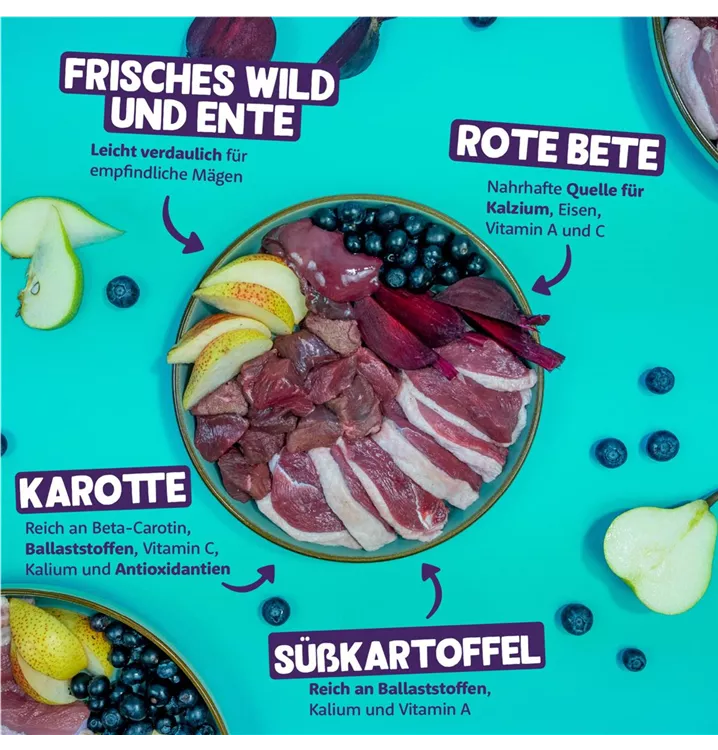 Wild 35%, Ente 25%, Süßkartoffeln 2%, Rote Bete (getrocknet) 0,5%, Mineralstoffe, Mannan-Oligosaccharide (MOS), Leinsamenöl, Fructo-Oligosaccharide (FOS), Apfel (getrocknet) 0,13%, Birne (getrocknet) 0,05%, Blaubeeren (getrocknet) 0,05%, getrockneter Fenchel 0,01%, getrockneter Kümmel 0,01%, getrocknete Schafgarbe 0,01%, getrocknete Brombeerblätter 0,01%, getrocknete Mistel 0,01%, getrocknete Kamillenblüten 0,01%, getrocknete Enzianwurzel 0,01%, getrocknetes Tausendgüldenkraut 0,01%