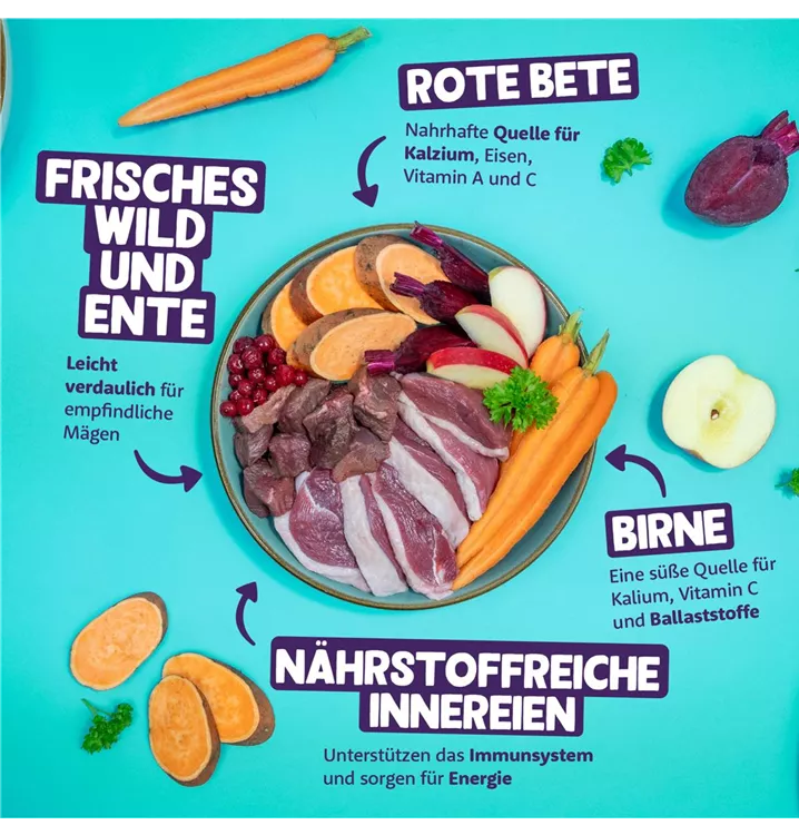 Wild 30%, Ente 26%, Mineralstoffe, Karotte 2%, Süßkartoffeln 1%, Rote Bete 1%, Preiselbeeren 1%, Apfel 1%, Petersilie 0,1%, Dill 0,1%
