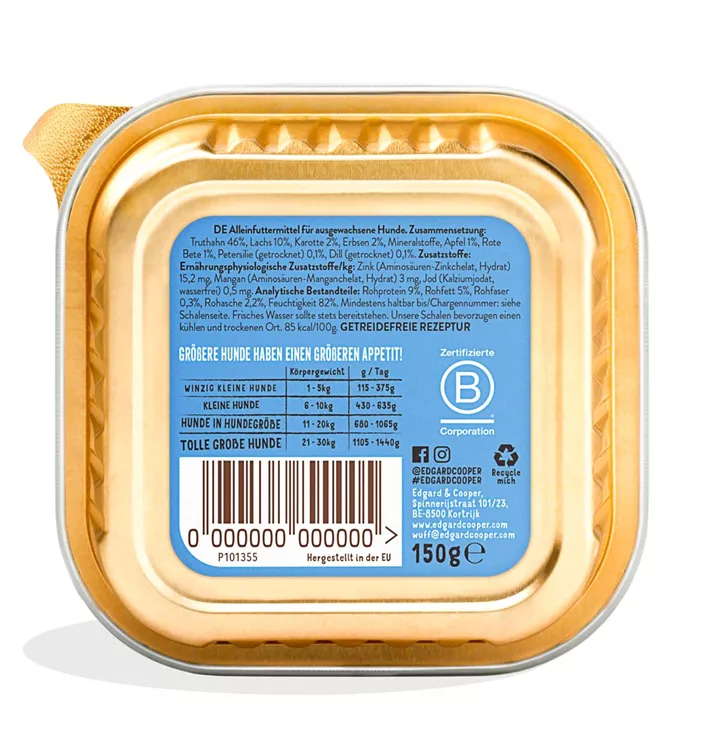 Truthahn 46%, Lachs 10%, Karotte 2%, Erbsen 2%, Mineralstoffe, Apfel 1%, Rote Bete 1%, Petersilie (getrocknet) 0,1%, Dill (getrocknet) 0,1%
