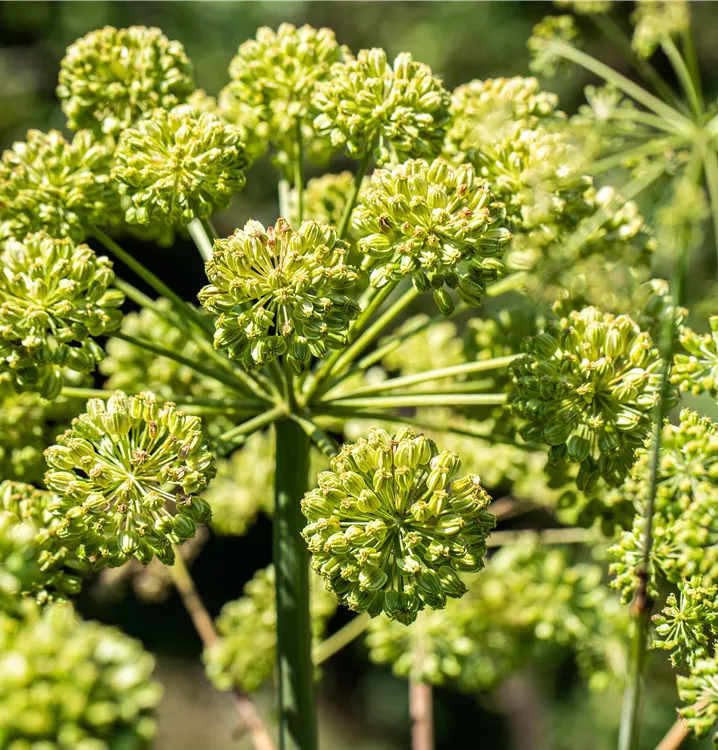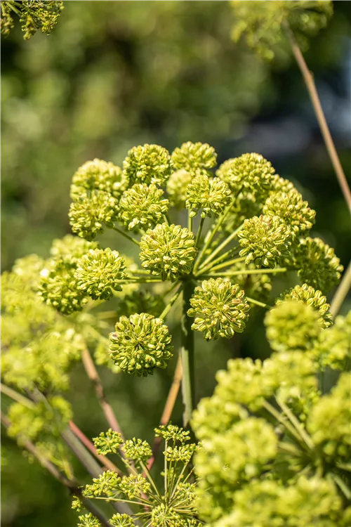 Angelica archangelica bringt Dolden mit grün-weißen Blüten von Juni bis August hervor.