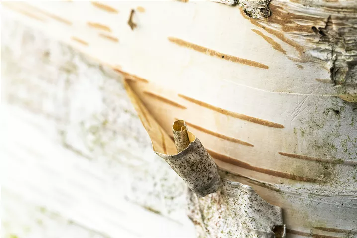 Die abblätternde Rinde dieses Laubgehölzes ist weiß gefärbt.